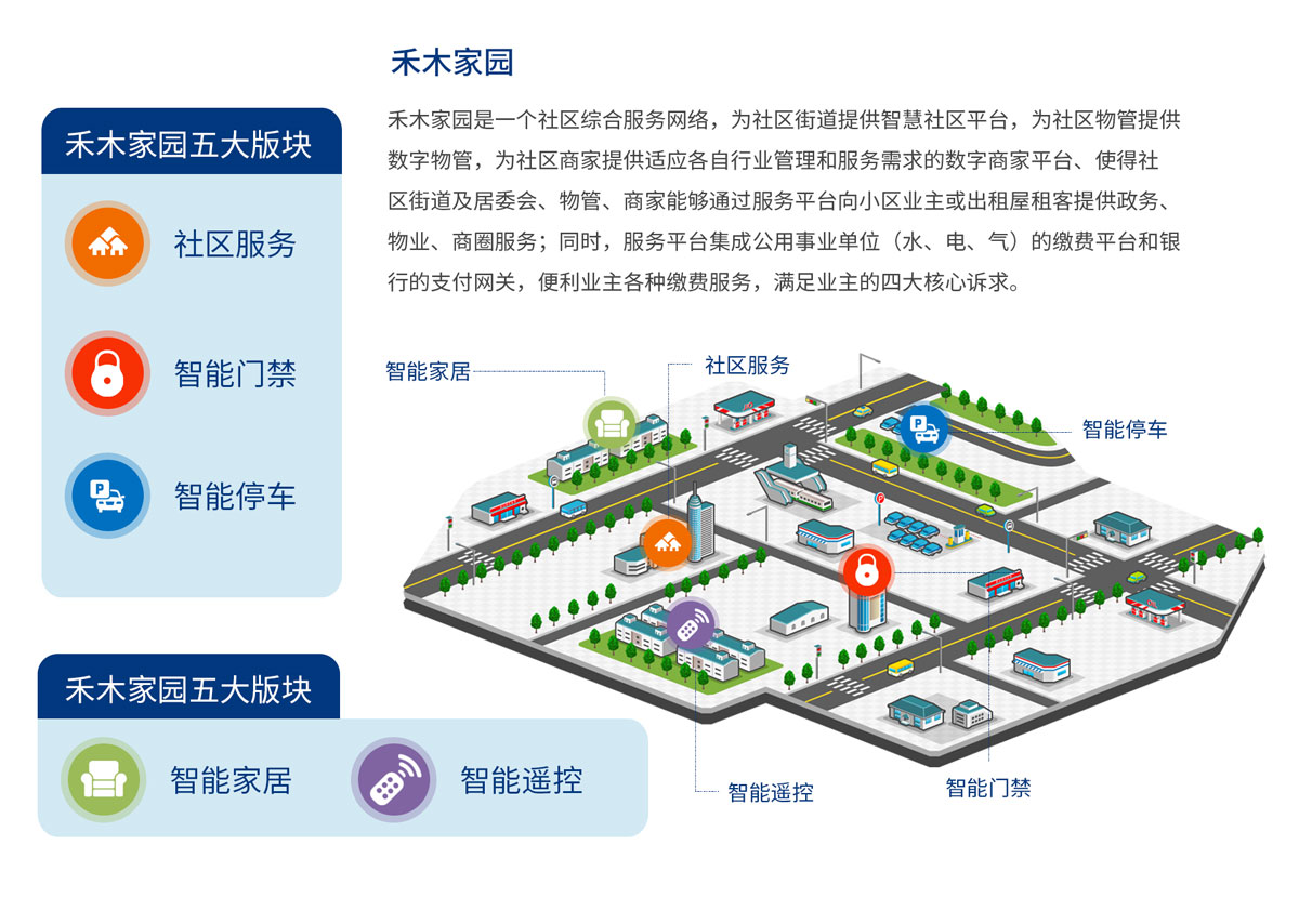 涵盖智能物业管理、安防、楼宇对讲、停车管理、家居、办公和养老系统等等,进行多方位的基础设施智能化改造业务。与电力、建筑、家居等行业建立战略合作关系,将移动互联网和物联网整合到相应产品,引领更多行业智能化的转型升级。我们以提供高效优质服务为目标,着力为小区居民带来舒适便捷的智能化生活体验。